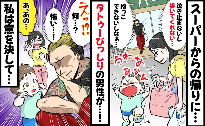 店の前で泣きわめくわが子に、タトゥーびっしりの男性が「なぁ、君…」どうしよう!?意を決して私は