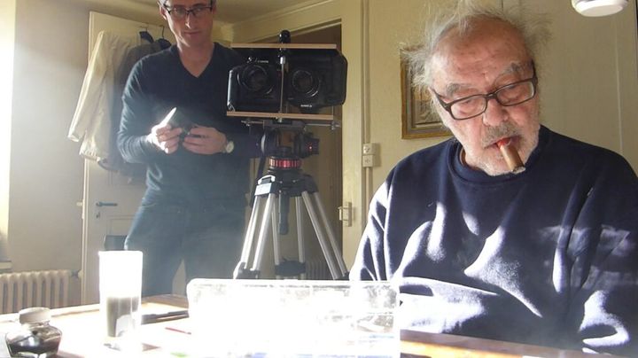 撮影監督として、ゴダール (右) と共同作業を行うファブリス・アラーニョ (左) 。