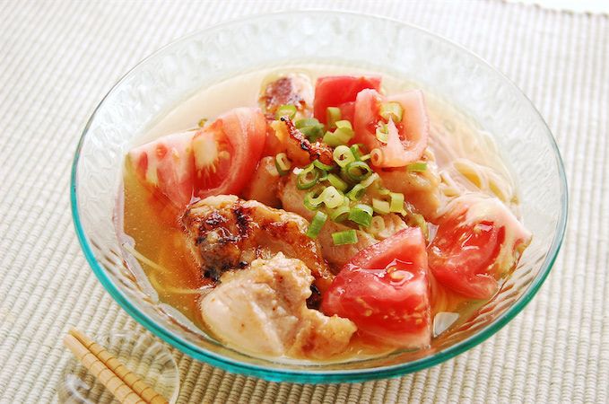トマトは湯むきしてあるので、皮に邪魔されることなく、ジューシーな果汁が違和感なくめんつゆと混ざり合います。鶏肉もやわらかくてジューシーな仕上がり。コク旨とさっぱりが共存する、そうめんアレンジです。