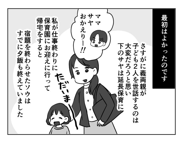 私(チナツ)は、夫のリュウと小学1年生の長男ソウ、保育園に通っている3歳の長女サヤの4人家族です。現在は10時~18時のパート勤め。自宅から徒歩圏内に住む義両親は、とても穏やかで優しい人たちです。この度、夫から正式に義実家での同居の提案がありました。その理由は、①長男のソウが小学校に上がると、帰宅時間が早くなるから ②私が早く正社員になれるように ③義両親、とくに義母が私たち家族をサポートする気満々だから……です。いろいろシミュレーションをしてみましたが、同居したほうがすべての物事がうまく回る気がして、私は同居に踏み切ったのでした。