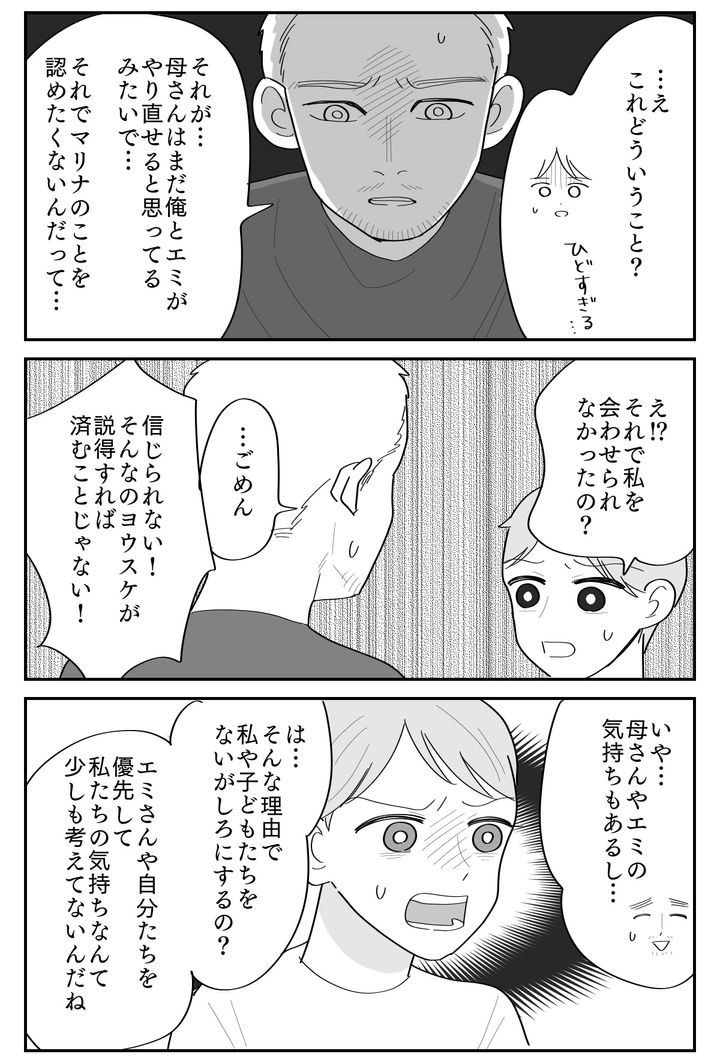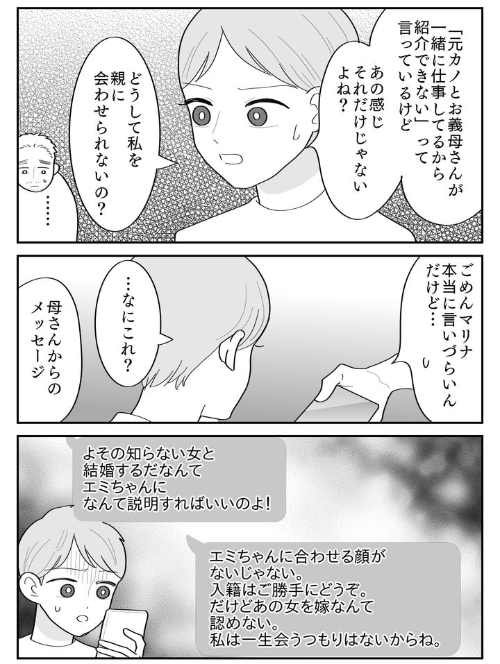 私が問い詰めると、ヨウスケは自分のスマホを差し出してきました。「母さんからのメッセージ。本当はマリナには見せたくなかったんだけど……」その文面は私に対する憎悪に満ち溢れていて、思わず気分が悪くなってしまうほどです。