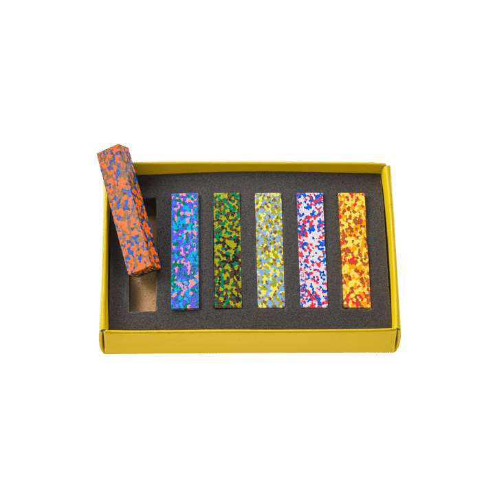 黄色い箱にスッキリと収められたたたずまいは、まるでチョコレートのよう!いろんな色をモザイク状にミックスした6色のクレヨンのパレットは、それぞれ印象派の画家クロード・モネの代表作がモチーフ。『黄昏 ヴェネツィア』や『睡蓮の池 緑のハーモニー』などを表現した色は、線を引くと混じり合い名画が目の前に現れたみたいに眺めているだけで美しい。