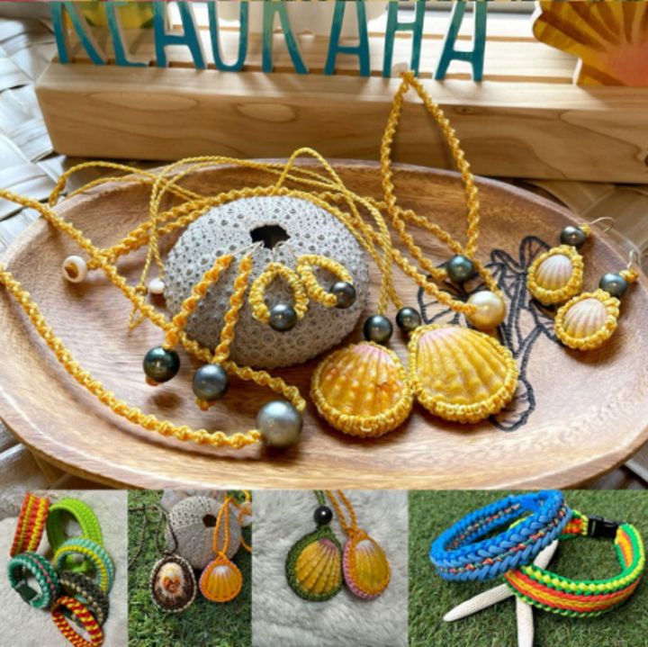 オピヒシェル、サンライズシェルを磨いてネックレスに。また紐を編んでタヒチアンパールチョーカーやブレスレットも作れます。パラコードを編んでわんちゃん向けの首輪作りも可能です。世界に1つだけの手作りアクセサリー作りを是非ご体験ください。