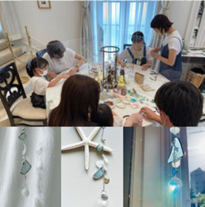 世界に一つだけの「シーグラスサンキャッチャー」作り体験。太陽の光に当てると虹の光が部屋中に飛び散る「サンキャッチャー」というインテリアを作ります。材料は、海に長年漂ったガラスが丸くなった「シーグラス」。 繋ぐだけで簡単に作れるので、子供〜大人まで体験でき、環境にも優しい、海をイメージした美しい作品が作れます。