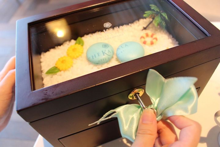 プティフールがたくさん入ったジュエリーボックスは、上面の蓋には鍵がかかっているため、自分で手元の小さな鍵を挿して開けるという素敵な演出付き!