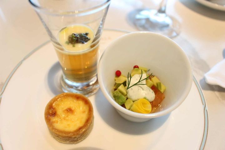 「コンソメジュレとマイスのヴルーテ キャビアリ キャビアとフレーバーオイル」(写真左上)は、コンソメスープととうもろこしのジュレの上にキャビアをオン…!スープは一口味わうとさっぱりとした印象ですが、後々スパイシーなうま味も感じられます。