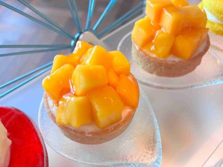 とくに心惹かれるのは、艶めくマンゴーが宝石箱のような「タルトマング・マスカルポーネ」。マスカルポーネは、バニラビーンズがたっぷりと入っていて、カスタードのような優しい甘みに仕上げられています。