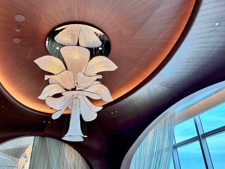 空間の真ん中にそびえるのは、オーキッド(ラン)と横浜のバラをかけ合わせたオリジナルデザインのシャンデリア。ゴージャスな佇まいに目を奪われながら、席に着きます。