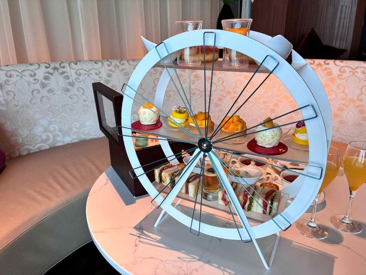 ケーキスタンドは、横浜のランドマークともいえる観覧車「コスモクロック21」をかたどったオリジナルのもの。後ろから見てみると、より観覧車感を感じられます。