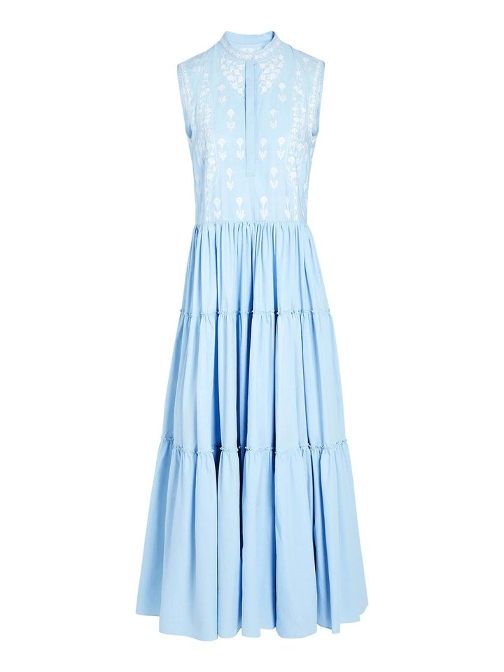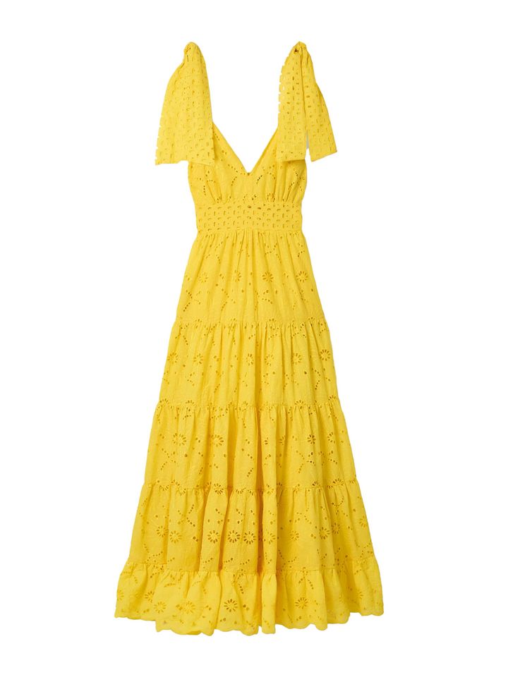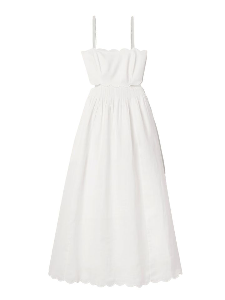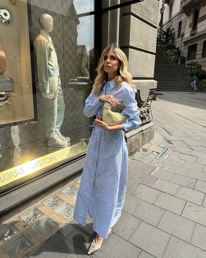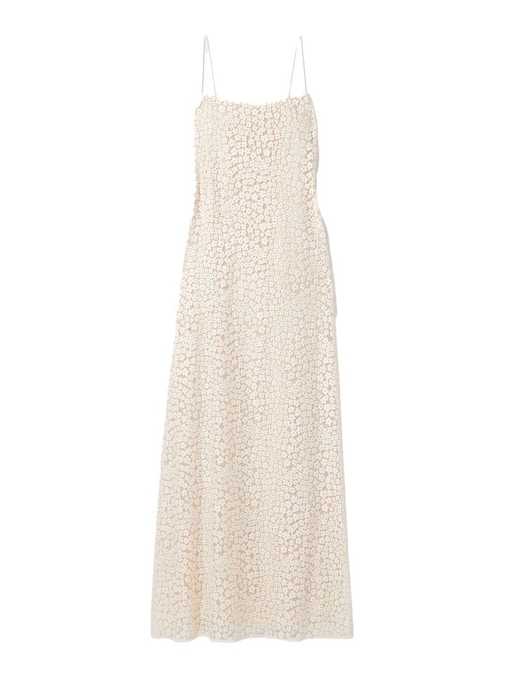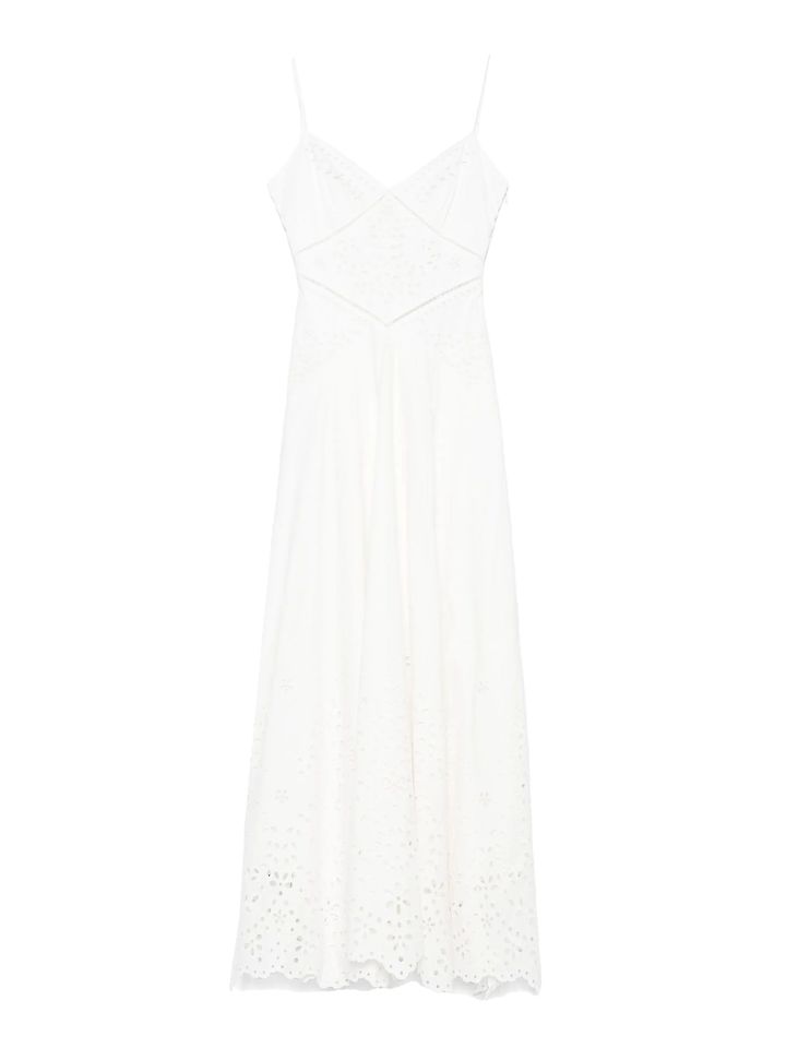 最後に紹介するのは、クラシックなマキシドレスを“エレガント”に進化させた刺繍入りデザイン。ブロドリーアングレーズの繊細なディテールが、装いに奥行きを添える。ウエストをベルトでマークしたシャツドレスや、オフショルダーのスタイルなど、どちらもヒールサンダルを合わせれば、夜のお出かけにも映える華やぎスタイルが完成する。