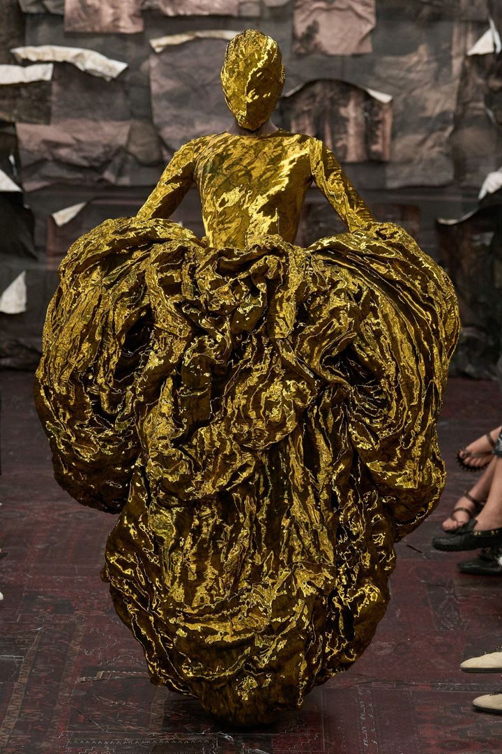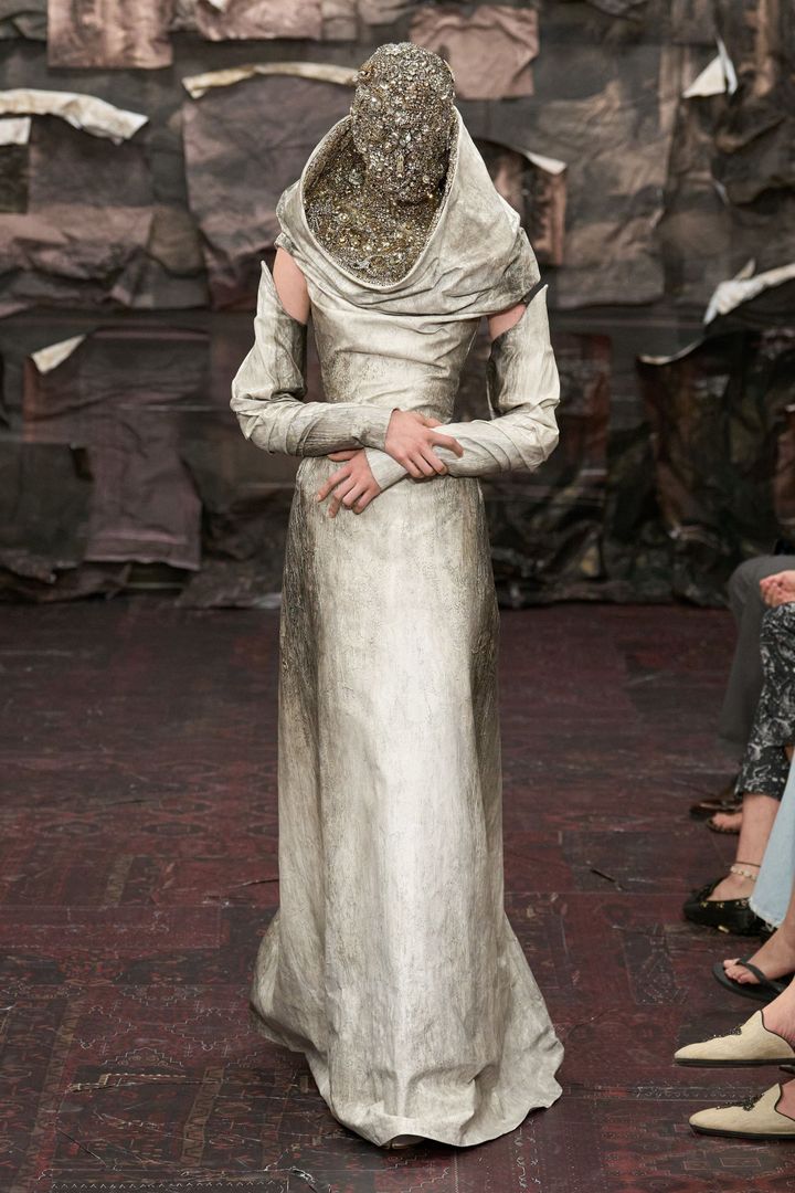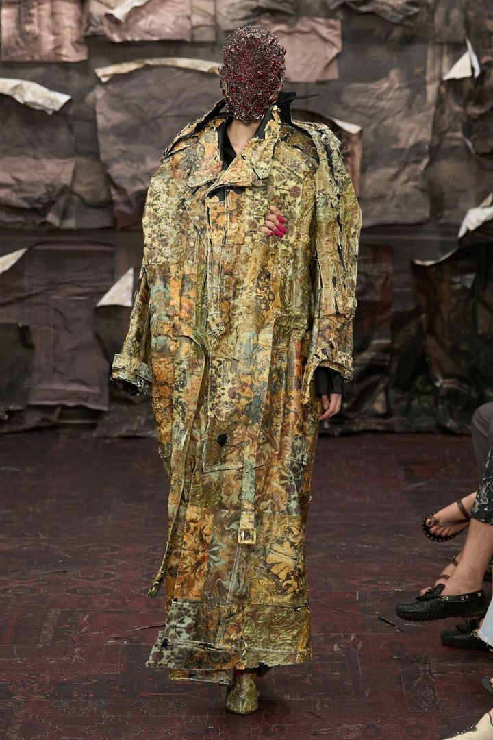そして彼は、自身のスタイルも存分に発揮している。不気味なオーラを纏ったゴシック教会の彫像を思わせるルックに、発光するようなメタリック加工が施されたベルベットのドレープ。リサイクルされたバイカージャケットはマルジェラの定番だが、それも壁紙をプリントしたパッチワークで覆われていた。