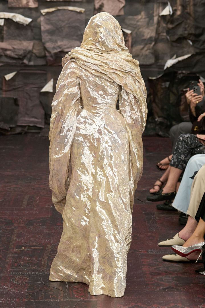 ショーの前、マーティンスはこう話していた。「私はブルージュ出身なのですが、そこにはどこかゴシック調の陰鬱な空気が漂っているんです。ブルージュにはフランダース地方の厳かな雰囲気があり、もちろんそれはマルタンにも通じるものです。彼は私たちの服に対する見方を変えました。ですから、このメゾンの一員になれたことは非常に身に余る光栄です。そして当然、最高のクチュリエであるジョン・ガリアーノの後任ということもあって、さらに身が引き締まる思いです」
