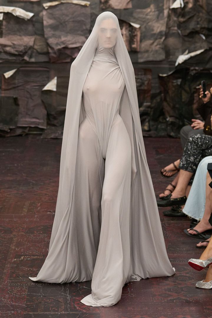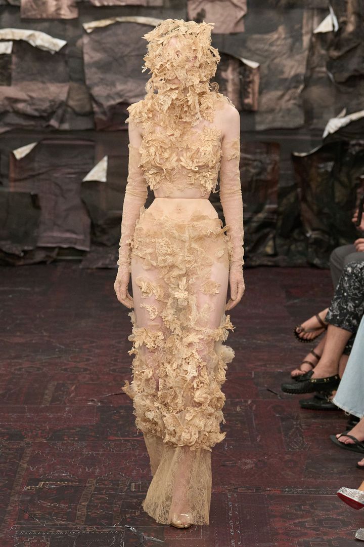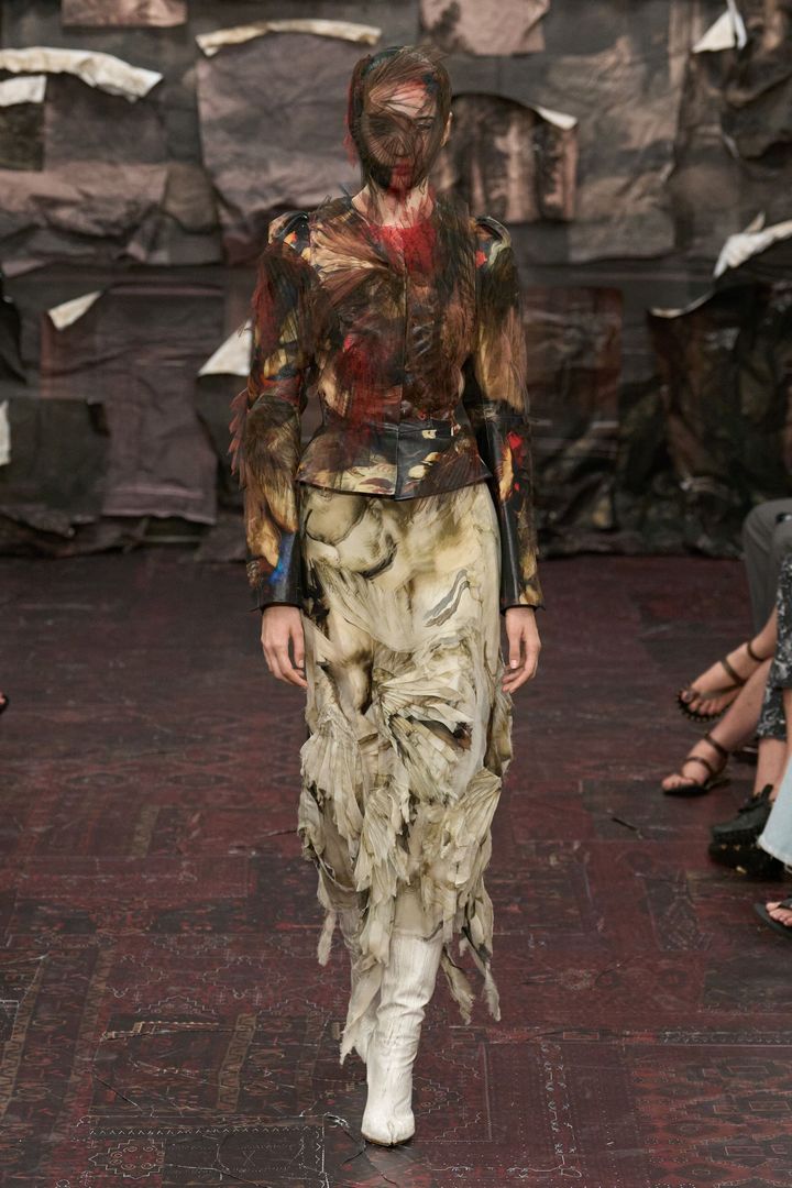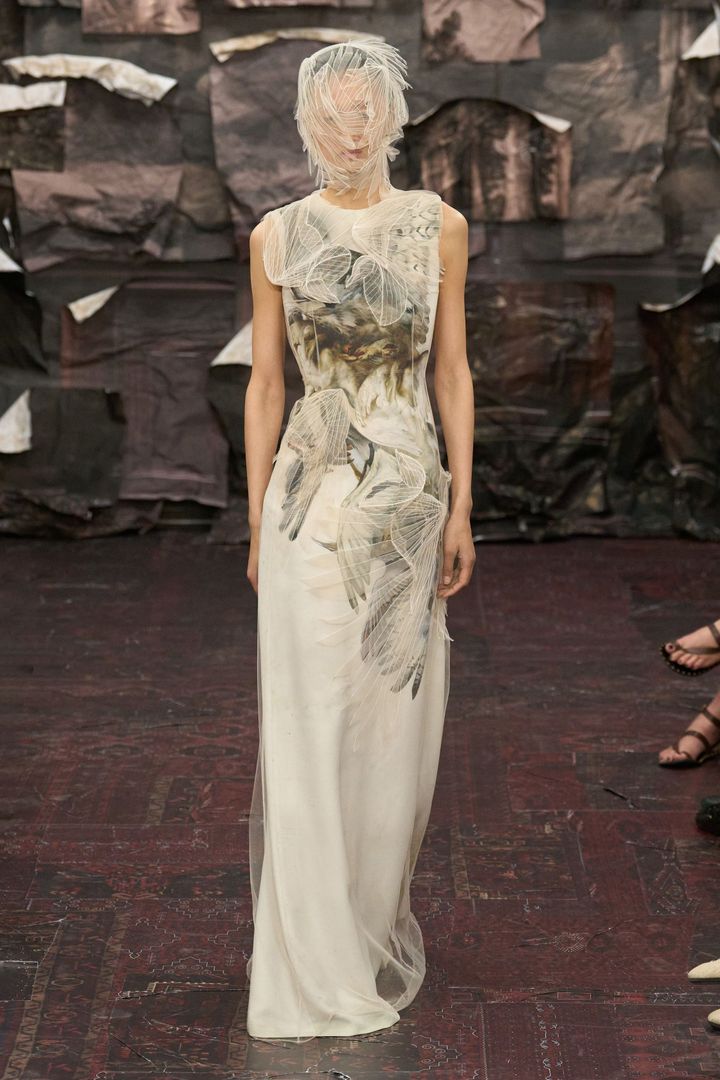 それから、よりデリケートなデザインからなる「チャプター(マーティンスはこう表現する)」が続いた。チュールのフェザーに翼、プリントの表面に咲き乱れる花、シアードレスから剥がれるようにあしらわれたレースのカットアウト。そこに、ケープのようなドレープがかった3着のドレスが登場すると、ぞくっとするような感覚を覚えた。このヴェールのようなルックの下には不思議な構造のコルセットがのぞいており、ヒップは突き出し、フロントはやや盛り上がっている。マーティンスはここでガリアーノにオマージュを捧げていたとも読み取れる。