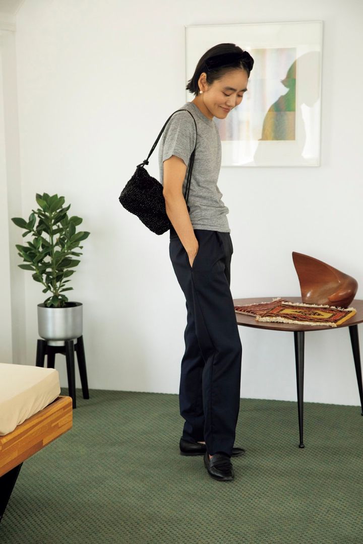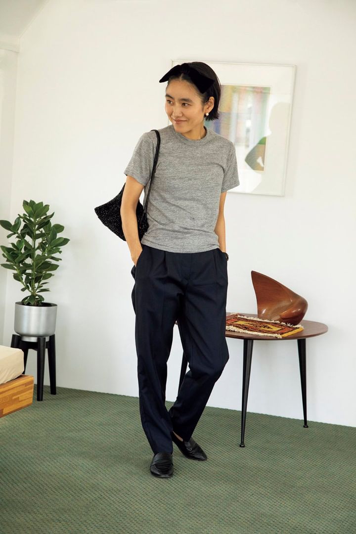 「年齢を重ねるにつれて、Tシャツにデニムよりも、Tシャツにスラックスを合わせるほうがしっくりくるように。プラスローファーが今の自分にちょうどいいバランスかなって思っています。ただ、これにレザーのバッグだとつまらないので、黒でもビーズの可愛らしいものをチョイス。カチューシャを着けたり、顔まわりは盛りたい気分」