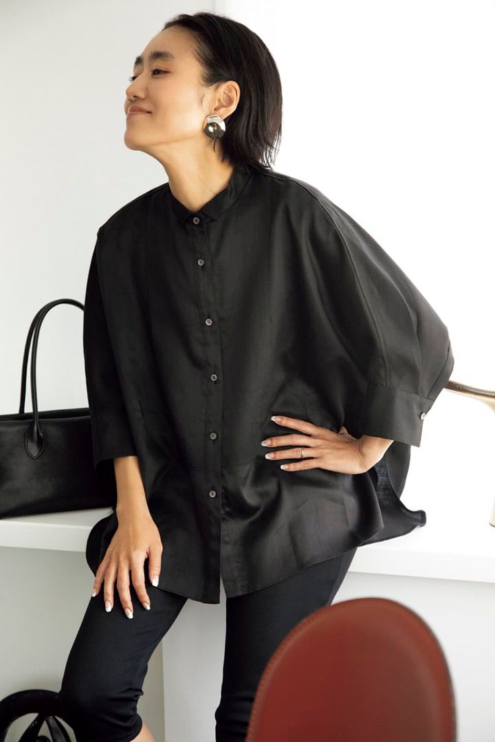 ebureのシャツ、COUDREのサイクリングパンツ、Alexander McQueenのピアス、THE ROWのバッグ、MANOLO BLAHNIKのサンダル/全て本人私物