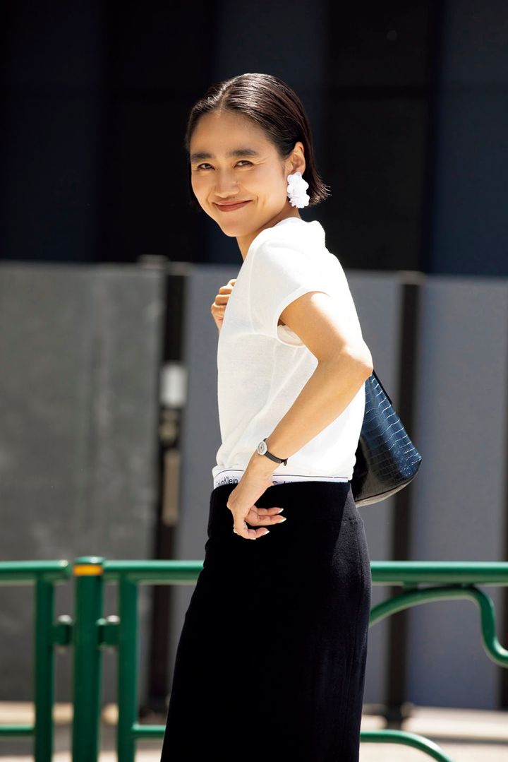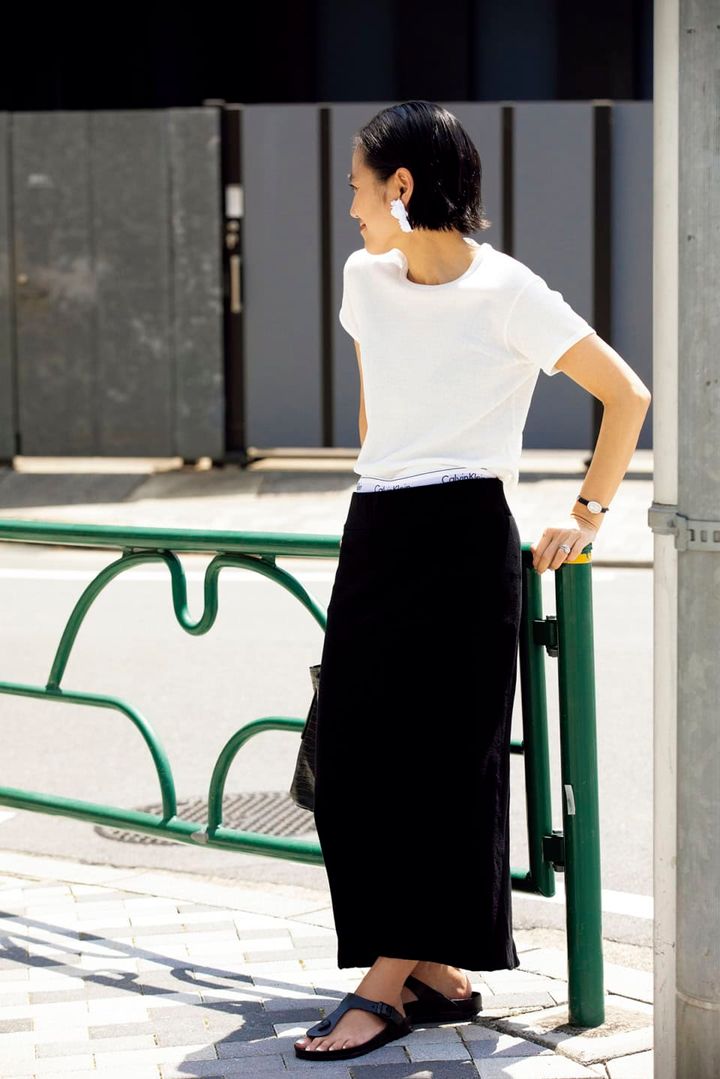 「女っぽいタイトスカートをカジュアルにはくのが好き♡ といっても、Tシャツを合わせればそれでOKというわけでもなく……。かっちりしたものよりも、程よくヌケ感が出る薄手の肌着的なものを選ぶのが重要だったりします。あと、足元はビルケンのサンダル率高め! スカートからCalvin Kleinのボクサーショーツをチラ見せさせるのも小さなこだわり」