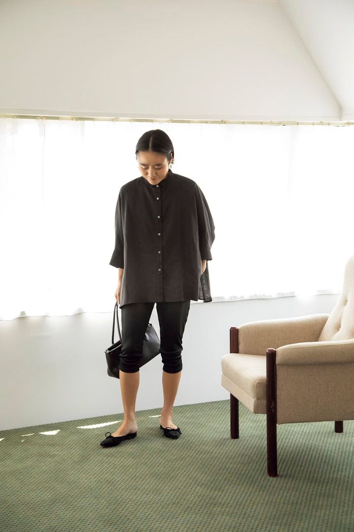 「きちんと見えするという点からしてもシャツは便利。これは小さめの襟で、着やすいんです。ボトムをスラックスではなく、サイクリングパンツにすることで、印象がガラリと変わるから不思議。かなりのサイクリングパンツマニアで、たくさん持っているのですが、カジュアルダウンにめちゃくちゃ役立ちます!」