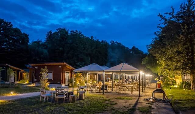 「BBQサイト」は緑に囲まれた元小学校の校庭。18時30分から22時の間なら自由に利用できて、愛犬と一緒に食事もできます。