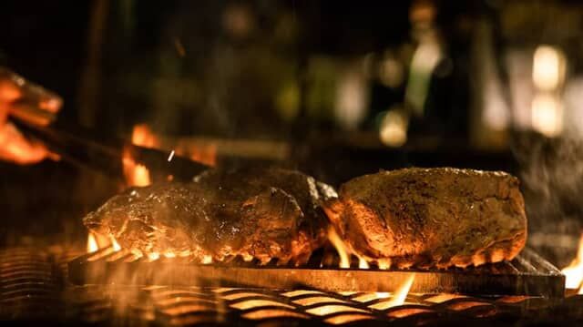 肉はシェフがセンターピットでちょうどいい焼き加減に焼いてくれるので、バーベキューやグランピングの初心者も安心。ステーキはもちろん、カットされたローストポークとローストビーフも食べ放題。ステーキは好みに合わせてスキレットでさらに焼くこともできます。