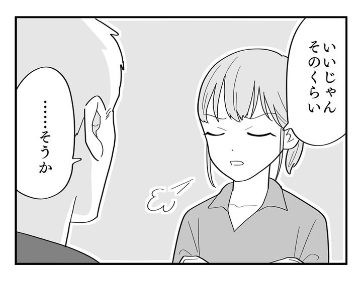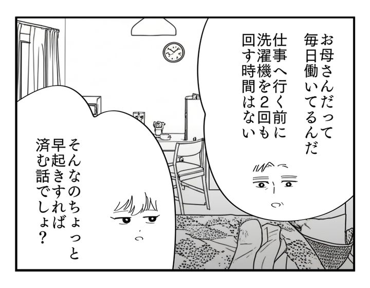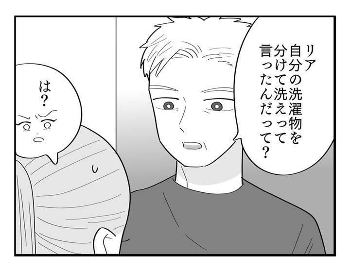 父親としてリアちゃんと向き合うダイキさん。もし要望を叶えようと思うと、毎日洗濯しているソノミさんに負担をかけてしまうと諭します。しかしリアちゃんの口からは「いいじゃん、そのくらい」という言葉が出てきました。出勤前の慌ただしい朝にもう一度洗濯機を回す労力が、「そのくらい」……? ダイキさんにはその言葉が引っかかったのでしょう。リアちゃんに対して自分で洗濯をするよう言い放ちました。