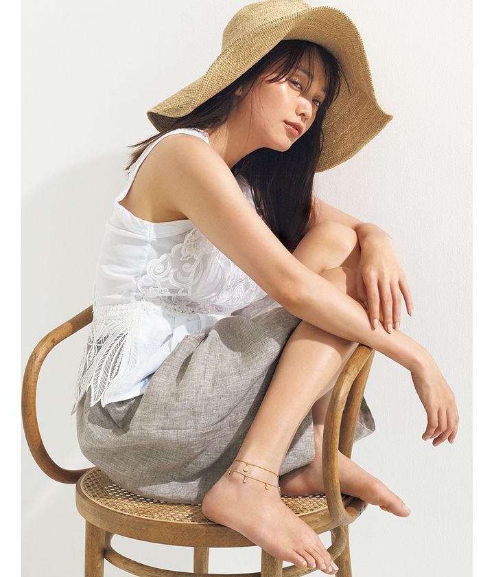 アンクレットともに「セルパンボエム」[YG、DIA]〈上〉¥440,000〈下〉¥682,000※ともに予定価格(ともにブシュロン/ブシュロン クライアントサービス)レーストップス¥33,000(マウリツィオ ミコノス/サードマガジン)タンクトップ¥15,400(チノ/モールド)ハーフパンツ¥77,000(ガブリエラ コール ガーメンツ/サロン アダム エ ロペ)ハット¥26,400(ラック オブ カラー/ジャック・オブ・オール・トレーズ プレスルーム)