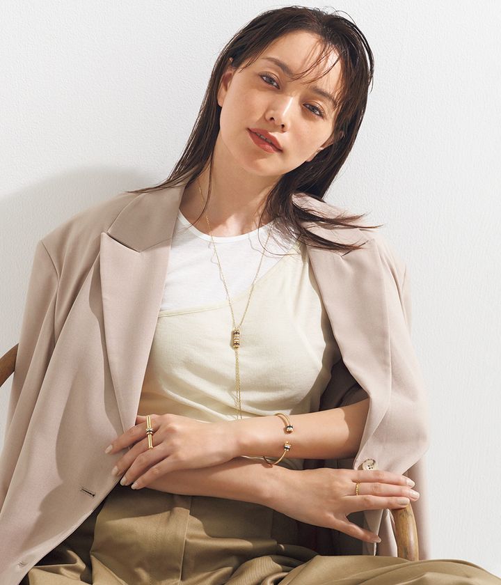 さまざまなマテリアルとテクスチャーが調和。ネックレス、バングル、左手リングすべて「キャトル クラシック」〈ネックレス〉[YG、PG、WG、ブラウンPVD、DIA]¥1,254,000 〈バングル〉[YG、PG、WG、ブラウンPVD、DIA]¥1,029,600〈リング〉[YG、PG、WG、ブラウンPVD、DIA]¥1,597,200右手リング「キャトル クル ド パリ」[YG]¥188,100※すべて予定価格(すべてブシュロン/ブシュロン クライアントサービス)ジャケット¥39,600(プロヴォーク デザイン ブティック/ジャック・オブ・オール・トレーズ プレスルーム)タンクトップ¥15,400(ファイブ アウェアネス/カレンソロジー 二子玉川)パンツ¥51,700(ザレイテスト/ショールーム ロイト)