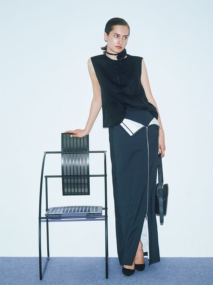 落ち感もキレイに出る、なめらかな素材のネイビースカート。サイドジップを開くと、ウエストを折り返したような左右非対称な見た目に。タイトスカートでもコンサバに陥らないエッジの効いたルックスと、ジップを閉じてすっきりとしたハイウエストとの2WAY仕様。