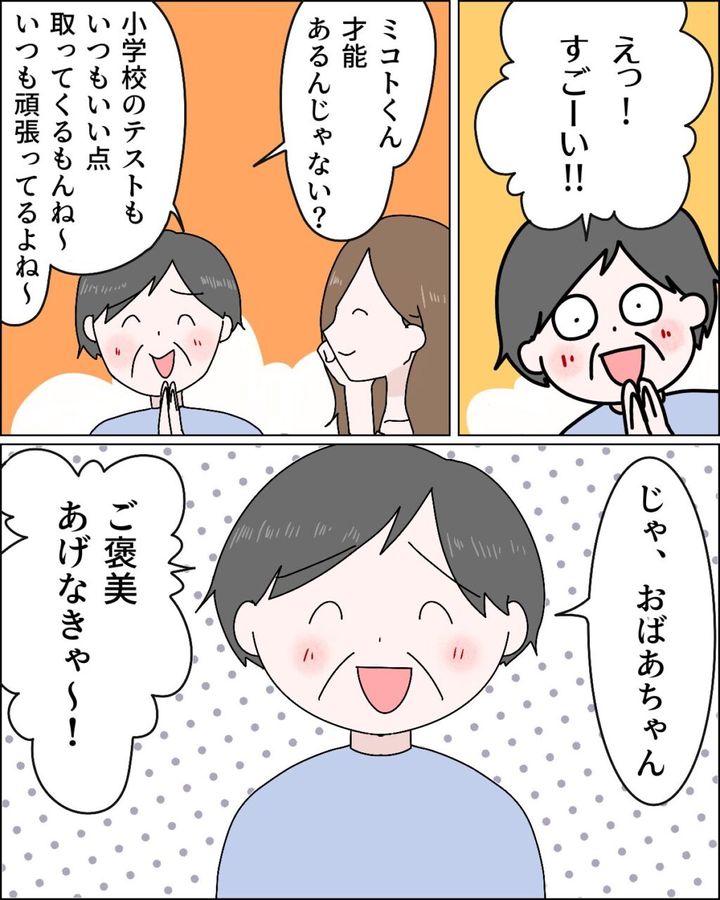 義母は「えっすごーい!!」と目を丸くして大喜び。「ミコトくん、才能あるんじゃない?小学校のテストもいつもいい点取ってくるもんね~、いつも頑張ってるよね~」と褒めちぎりました。そして「じゃ、おばあちゃんご褒美あげなきゃ~!」と嬉しそうい言いました。