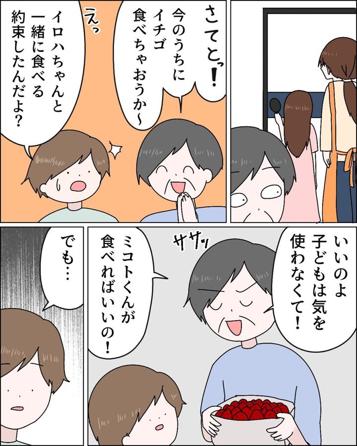 私とイロハが座敷へ向かったのを見届けた義母に「さてとっ!今のうちにイチゴ食べちゃおうか~。」と言われたミコトくんはビックリ。「えっイロハちゃんと一緒に食べる約束したんだよ?」と義母に説明しました。それでも義母は「いいのよ子どもは気を使わなくて!ミコトくんが食べればいいの!」と、どうしてもイロハにイチゴを食べさせたくないようでした。