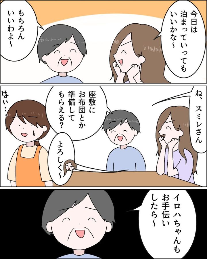 夫ヒジリさんの母親と同居しているスミレさんは、自分の娘イロハちゃんと同級生の、ヒジリさんの姉ミユキさんの息子ミコトくんのことばかりを義母があからさまに贔屓することにモヤモヤしていました。ミユキさんが突然やってきてミコトくんを実家に預け出かけるたびに、義母は大喜びでミコトくんにあれこれ世話を焼きたがりますが、実際に動かされるのは決まってスミレさん。義母はスミレさんに言いつけるだけで自分がミコトくんのお世話をしているつもりで満足しているのでした。イロハちゃんのスイミングスクールの送り迎えで出かけていたスミレさんが、義母に言われた『ミコトくんが食べたいから揚げ』やフルーツを買って帰ると「できあいのものを買ってきたの?」と不満を言われたり、イロハちゃんには食べさせるつもりがない態度を取られたりで、スミレさんはイライラを募らせていました。