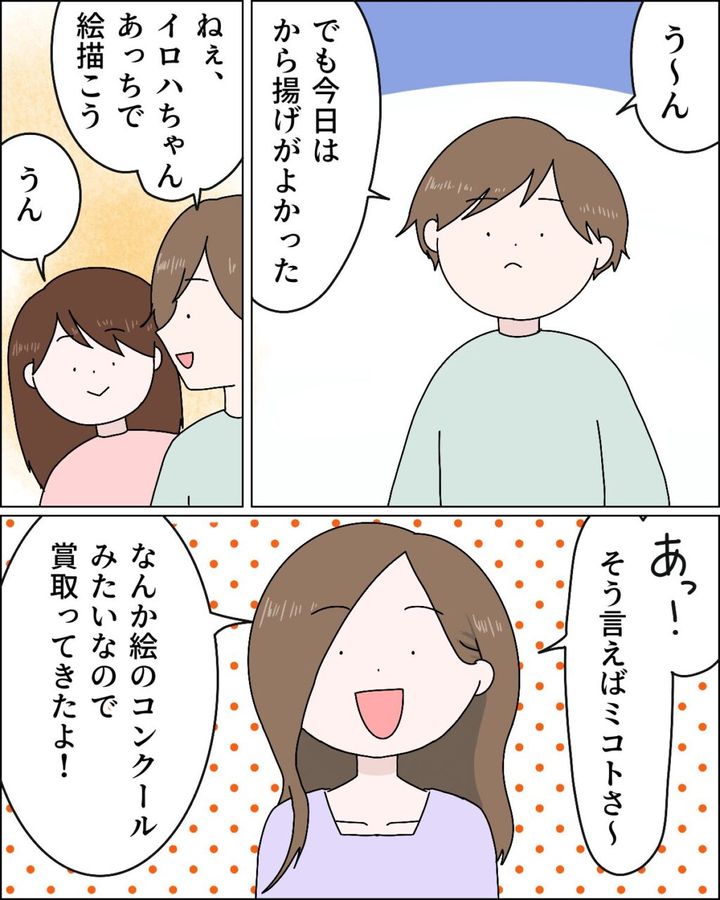 絵の話題で思い出したのか、ミコトくんが絵のコンクールで賞をとったとミユキさんが義母に報告しました。