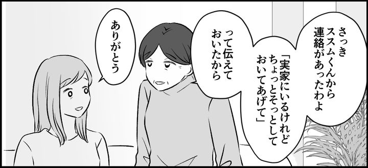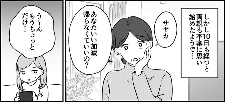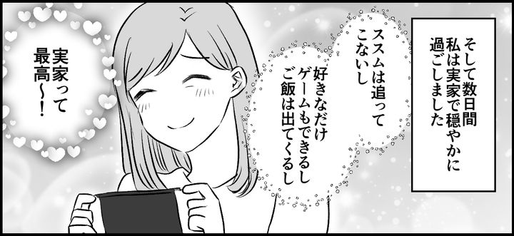 久しぶりの実家はやっぱり最高! ご飯は出てくるし、ゲームは文句も言われずやり放題。ススムがいない平和な日々を満喫していたのですが、10日後、さすがに両親が怪しむようになりました。