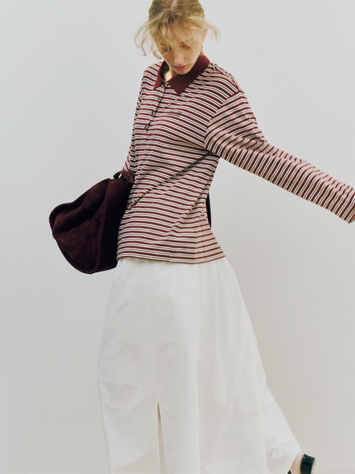 ボルドー+白にダークブラウンの極細ラインが引き締め役のランダムボーダー。古びた色みと大きなシルエットでおじいちゃんから譲り受けたようなポロシャツは、にごりのない白スカートで爽快感を。