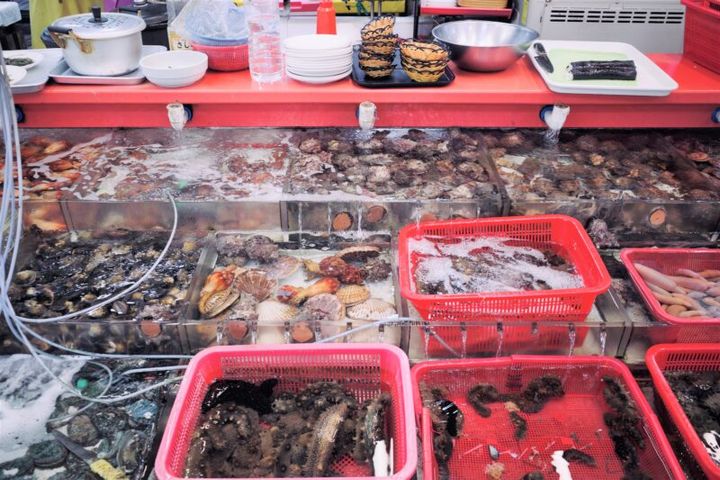 2006年にできた大きな市場棟のなかも個人店がずらり。新鮮な魚介を売っているだけでなく、その場で選んだものを調理して食べられる店がほとんどです。ヒラメの刺身、焼いたホッケ、アワビのお粥と、どれも港町ならではの新鮮さで家族連れや団体客に人気で、どの席も盛り上がっていました。