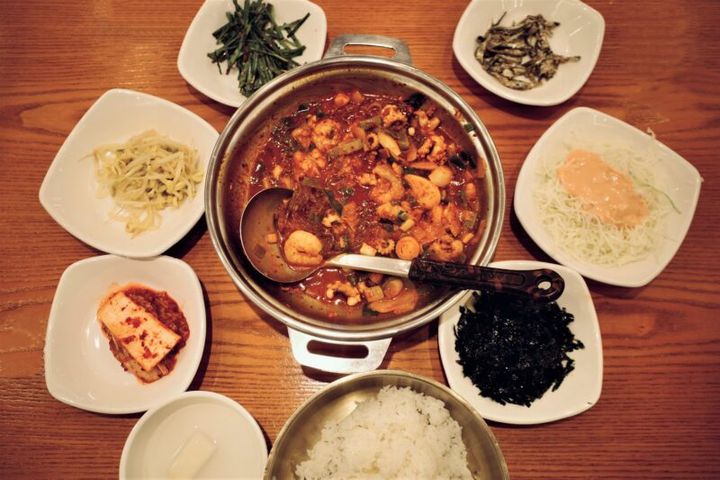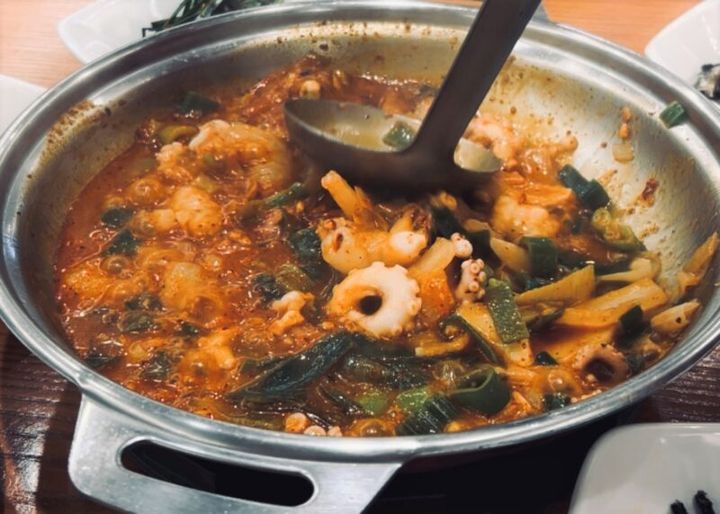 このエリアにはローカルな食堂もたくさん。釜山発祥の料理であるナッコプセで知られる人気店「ケミチプ本店」は、観光客も地元民も多く、女性一人でも安心して入れます。「ナッコプセ」とは、ナッチ=タコ、コプチャン=ホルモン、セウ=エビを具材にした鍋で、それぞれの頭文字から名づけられた料理。店員さんが目の前で調理してくれ、できあがったらごはんにのせ、ナムルやキムチ、のりと一緒に混ぜてピビンバに。やわらかいタコはかむほどうまみがしみ出て、ホルモンのコクと相まって、あとひくおいしさです。ちなみに辛さは選べるので辛いものが苦手な方でも安心。