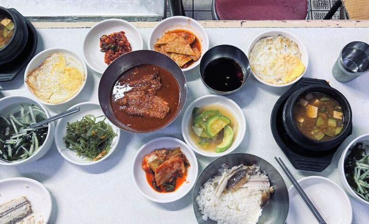 太刀魚の揚げ焼きに鯖の味噌煮、テンジャンチゲやワカメスープ、カリッと焼いた目玉焼きに、箸休めの古漬けのキムチやおかひじきのあえもの……。料理しているアジュンマたちは一見冷たく感じますが、食べていると「足りる?」「おかわりいる?」と声をかけて、さりげなくあれこれ世話を焼いてくれます。おかずは日替わりで1000円以内という安さ。釜山の日常の味が堪能できる店です。