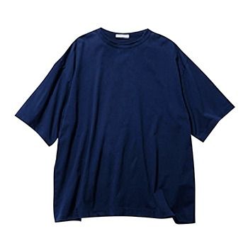スタイリストにもファンが多い、ATONのメンズ服。綿100%ながら、くたっとした上質な風合いが魅力。落ち着きのあるネイビーで選ぶと、白や黒ほど無骨に見えない品のよさも加味できる。