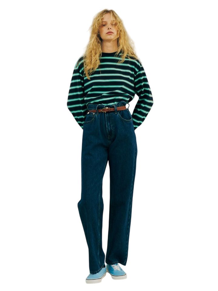 細くもなく太くもない、まっすぐでクセのないメンズのデニムのウエストをキュッとベルトで絞って穿く。メンズサイズだから自然と股上に余裕もでき、「これみよがしなハイウエスト」にならない。どんな服にも合わせやすい濃紺だから、カラーボーダー&シューズの合わせもバランスよく着地。 ネイビーボーダーTシャツ/ヒデン ジェムス(ロンハーマン) デニムパンツ(メンズ)/カルバン・クライン(カルバン・クライン カスタマーサービス)