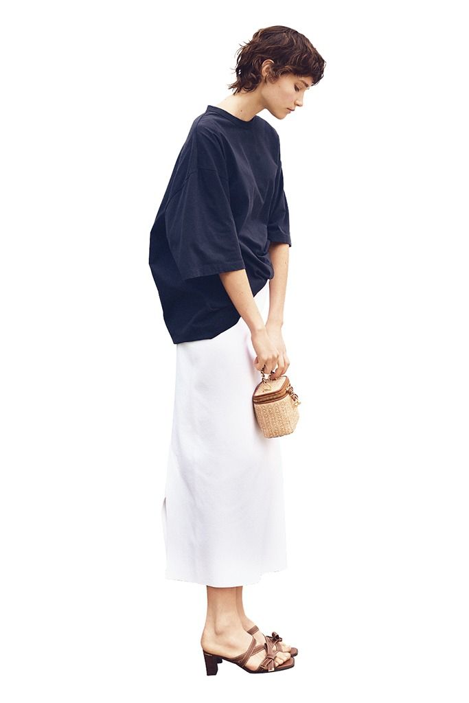 フロントだけを雑にインしてキレイめスカートをカジュアルダウン。そのままではやや勇気を伴う白の細身スカート。着るだけで脱力感が得られるTシャツを、着方でさらにくずして身近にシフト。はんぱなそでの長さも、フランクさに貢献。 ネイビーTシャツ(メンズ)/エイトン(ATON AOYAMA) スカート/LE PHIL(LE PHIL NEWoMan 新宿店)
