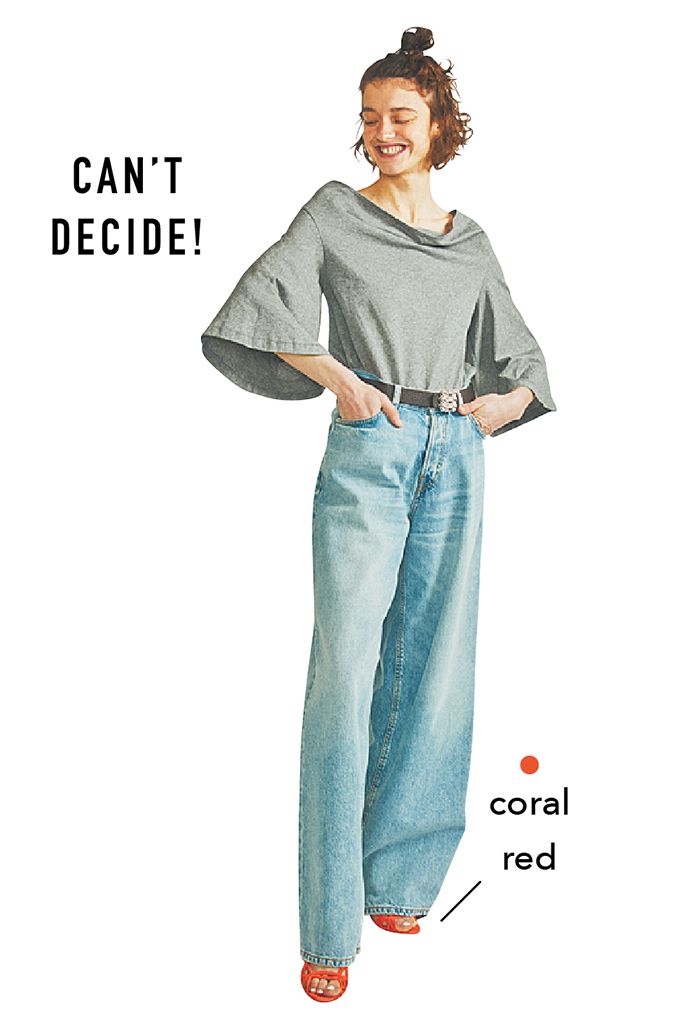 リラクシーなグレーTシャツとワイドデニムの組み合わせに、はつらつとしたコーラルレッドのサンダルをさし色的に活用。つま先だけわずかにのぞかせて、色を効かせるバランスが適度なアクセントに。ストラップつきで安定感も◯。