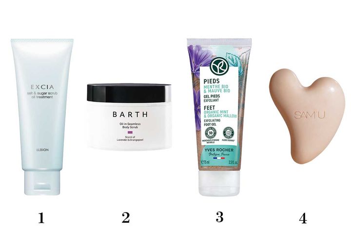 1 エクシア ソルト&シュガースクラブ オイルトリートメント 200g ¥6,600/アルビオン 2 BARTH オイルイン シームレス ボディスクラブ 200g ¥1,980 3 イヴ・ロシェ フットスクラブ 75㎖ ¥1,320 4 サミュ PHセン シティブクレンジングカッサバー 94g ¥2,200/サムシック コスメティックジャパン