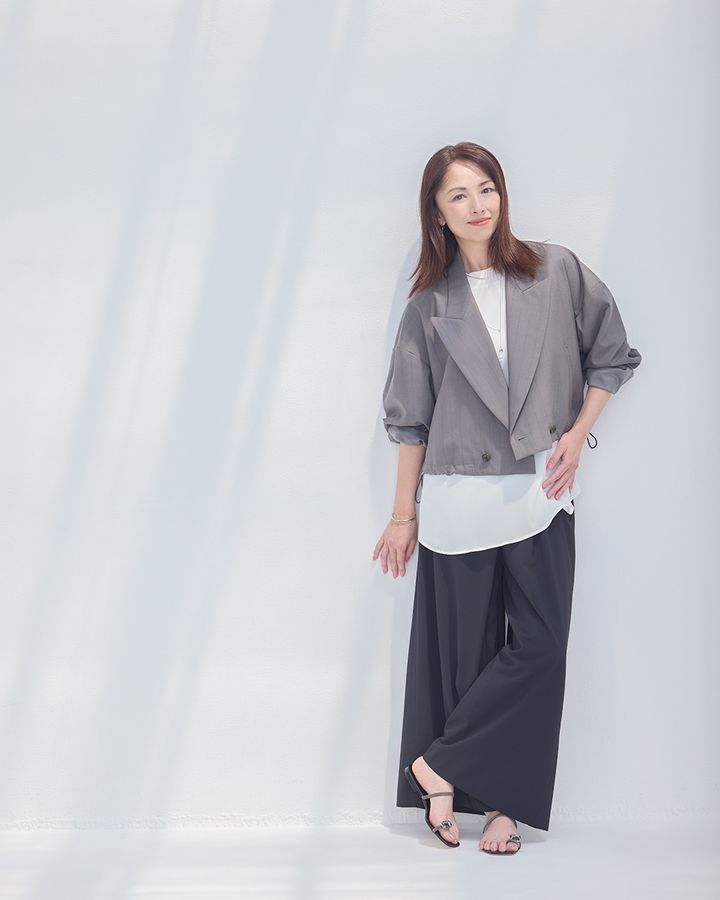 ジャケット¥ 71,500<UJOH>カットブラウス¥16,280 パンツ¥18,700<ともにMANO>サンダル¥39,600<il Sandalo of Capri>(すべてMANO)ピアス¥17,600 ネックレス¥25,300バングル¥ 29,700 (すべてJouete)チョーカー¥22,000(ete bijoux)