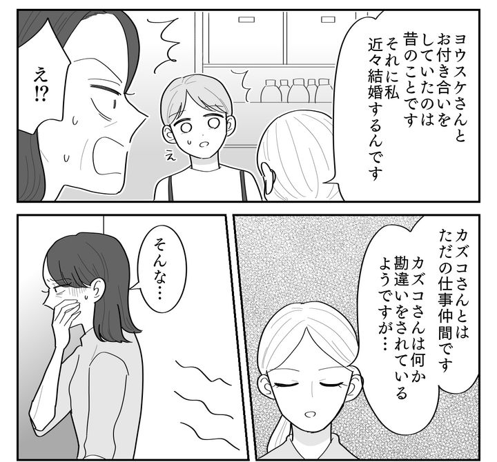 エミさんはいまお付き合いしている人と近々結婚するそうです。「いまはヨウスケさんとなんの関係もありません。カズコさんは何か勘違いをされているようですけど、私も結婚を控えているので困ります」そして私のことも励ましてくれました。