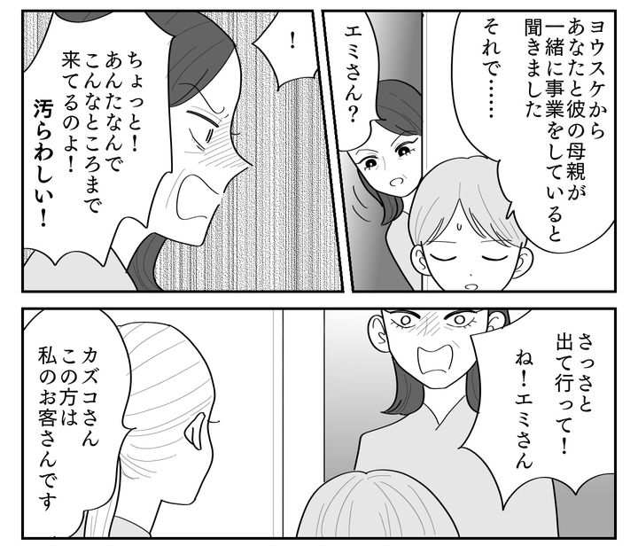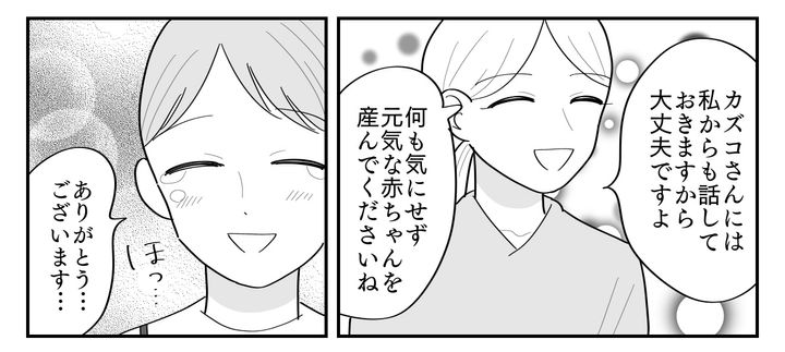 エミさんは私のお腹を気遣いながら、丁寧に応対してくれました。途中でお義母さんが気付いて怒鳴り込んできましたが、冷静にたしなめてくれます。「この方は私のお客さんです。今お話を聞いているところなので、少し黙っていてもらえますか?」