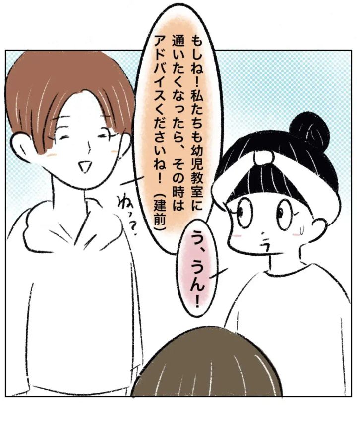 すると、マキちゃんママが「もしね!私たちも幼児教室に通いたくなったら、その時はアドバイスくださいね!」と空気を悪くしないようにすかさずフォローしてくれ、まるさんも「う、うん!」とそれに合わせました。