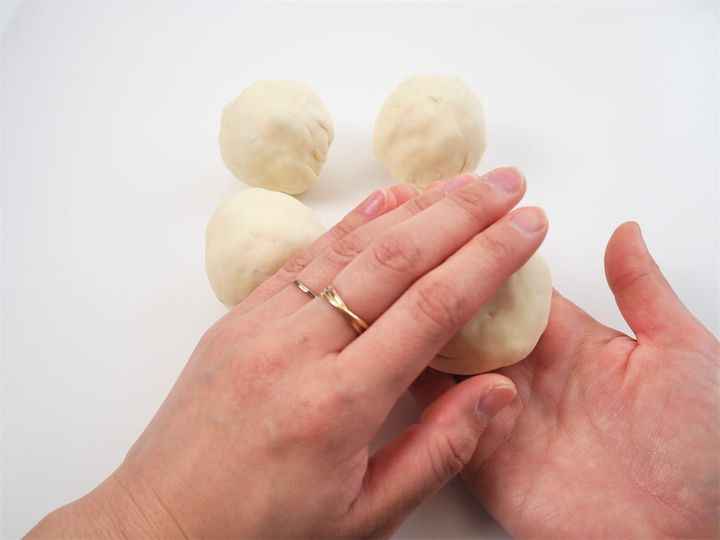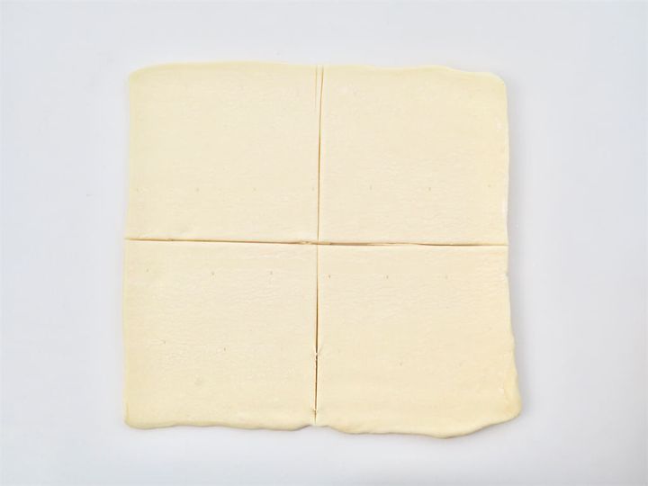 1. パイシートを常温に戻し、薄く伸ばして4等分に切り分ける。