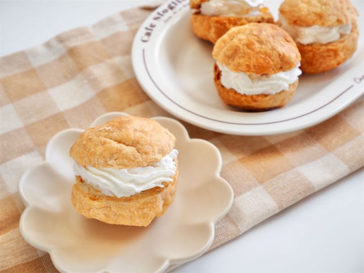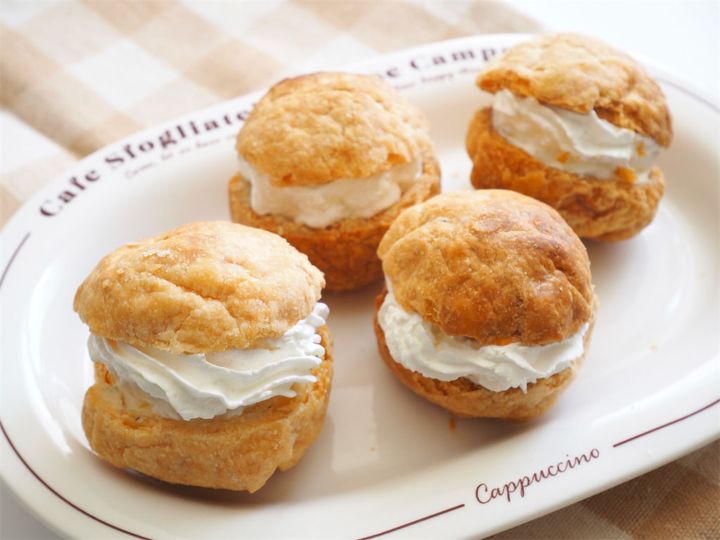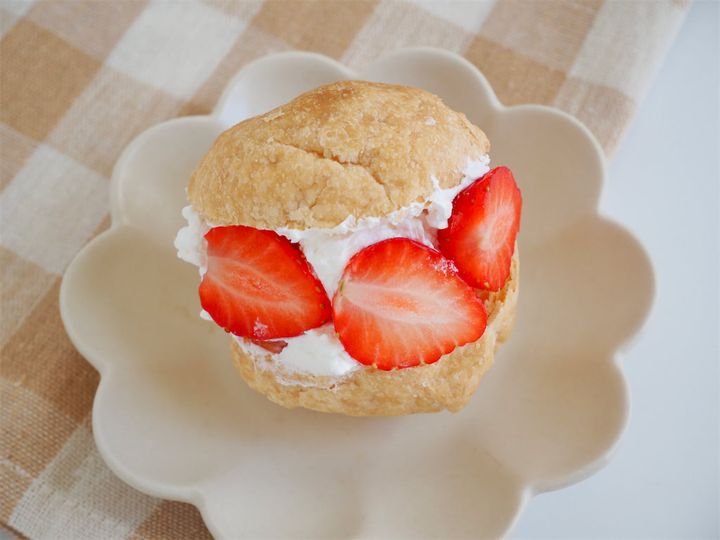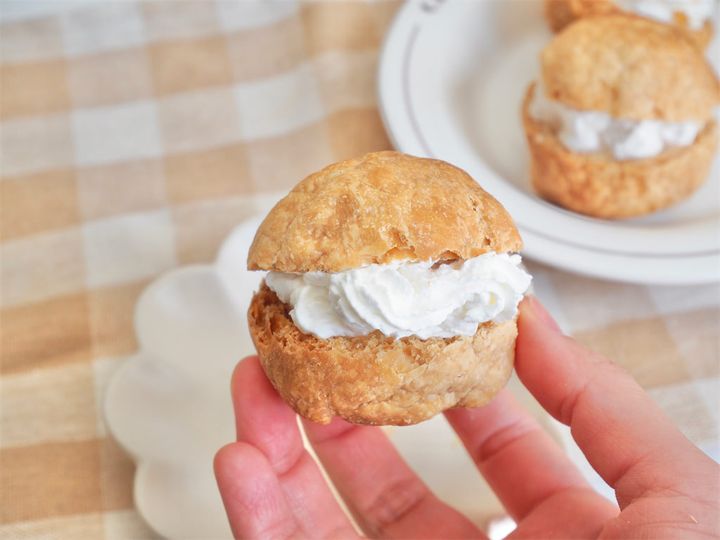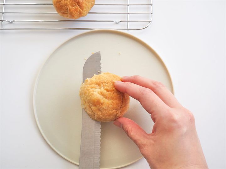 レシピでは「半分に切る」とありますが、よりシュークリームらしく仕上げたい場合は、上部を1/3ほどカットしてフタのように使うのがおすすめ。