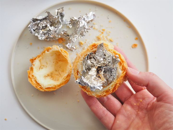 土台にするホイルは、ぎゅっと丸めすぎないのがポイント。取り外しの際に苦労してしまうので、ふんわり成形するのがおすすめです。もし焼き上がりのシューにホイルの粉がついていたら、やさしく削り落としてあげましょう。