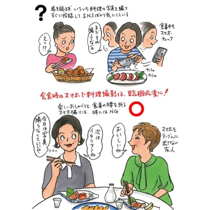 私がよくやる解決策は、写真撮影が手早く上手な友人に代表して料理を撮ってもらい、「あとでLINEに送ってね」というやつ。スマホのつき合い方は文字通り、スマートにね。