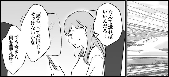 私は新幹線の中で、ススムに送るメッセージを考えていました。新幹線で片道3時間。時間はたっぷりあります。素直に「ごめんね」と言えばいいのでしょうが、おかしな意地が邪魔をします。スマホの画面を見つめて、メッセージを打っては消し、打っては消しを繰り返します。いや、やっぱり素直に謝ろう。私が悪かったんだから!